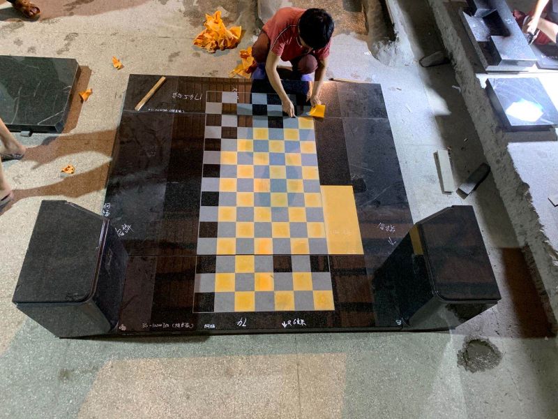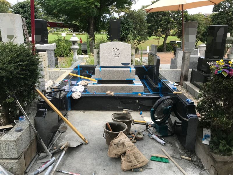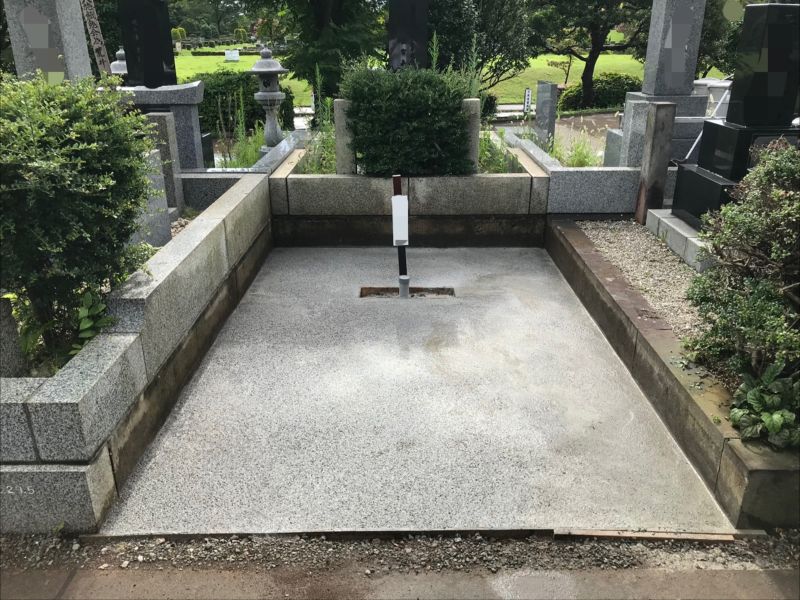 | 備考) | 入り口のフラット部分を広く取り、開放感のあるお墓となりました。外柵の滑り止めはお洒落な市松模様にして外柵の角へは立体感がでるようにライン加工を施しました。香炉と花立もお参りがしやすいように高い位置へ設置としました。全面石張り仕様ですのでお掃除もしやすく、物入には掃除用具などを保管する事も可能です。随所にこだわりのデザインを入れたデザイン墓の完成です。 |