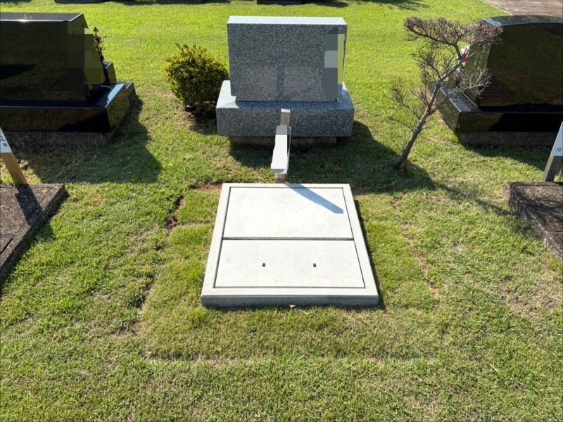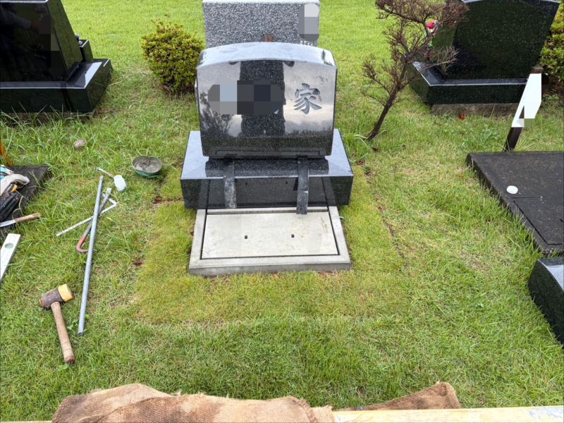 | 備考) | 墓石材として人気の高い中間色のインド材M10にて洋風のお墓を建てました。黒色と白色、薄緑色の模様が入った濃いめのグレー色で艶持ちも良く高級感があることから人気の石材となっております。墓石を経年劣化から守る為の屋根R加工、丸面取り加工、水垂加工の高級加工をお付けしました。 |